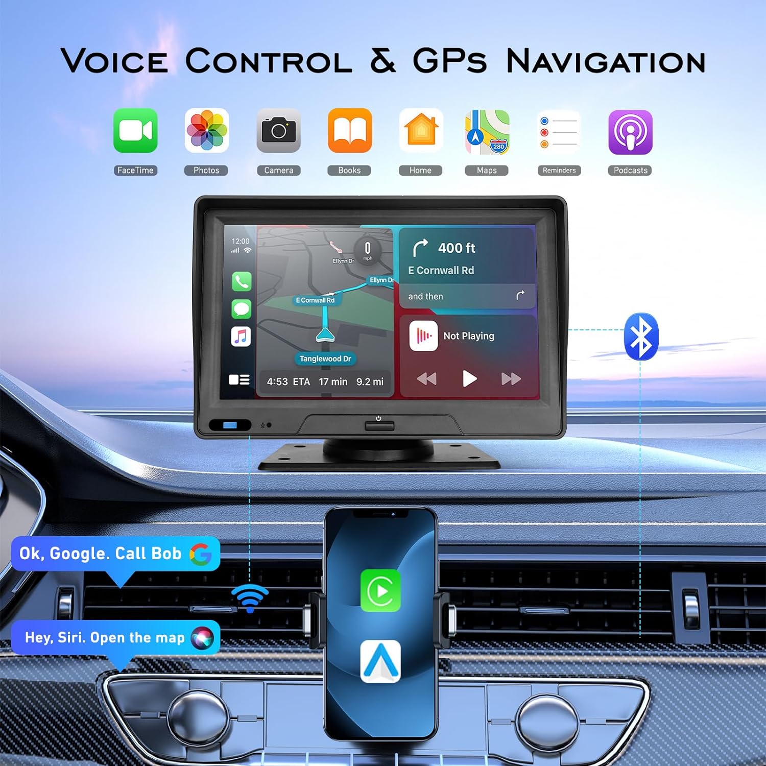 【Wireless Apple Carplay | Android Auto | Voice Control】The portable carplay screen stereo seamlessly integrates smartphones via Apple CarPlay and Android Auto. With hands-free voice control, you can access maps, music, and calls while driving, ensuring a safer and more convenient experience.